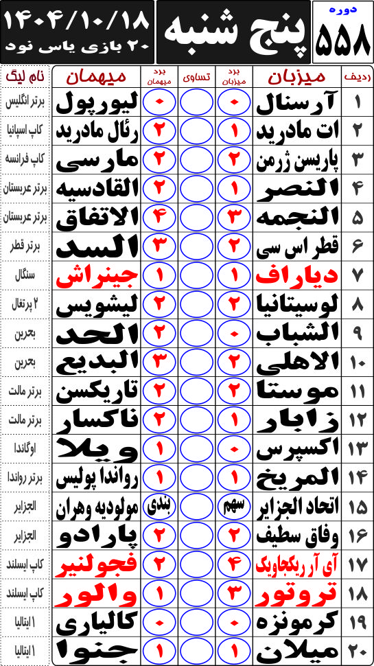 جدول دانلود فتوکل و نتایج 20 بازی روزانه شماره (558) |